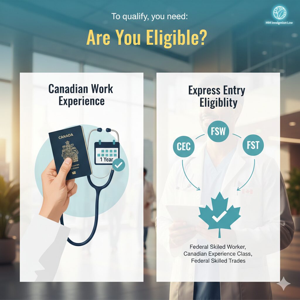 - Canadian Work Experience: You must have accumulated at least 1 year of full-time work experience (or an equal amount of part-time) as a medical doctor in Canada within the last 3 years.